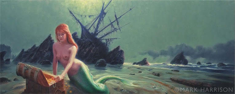 A mermaid goes through the contents of a treasure chest that she has retrieved from the wrecked ship thrown high onto the jagged rocks by the retreating storm. She doesn't seem that impressed. The model for the mermaid is the lovely Naomi who I have recently met and will be featuring in my next painting of an Orientalist interior.
