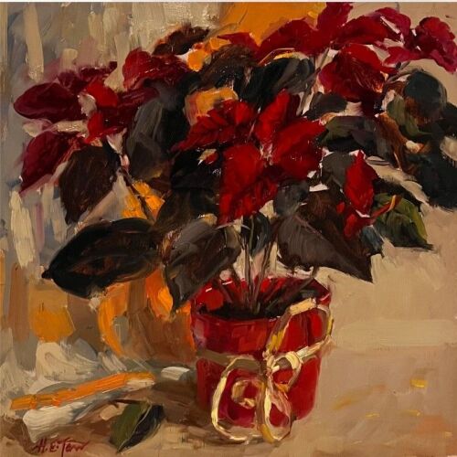 A rare opportunity to acquire an incredible original Helen Tarr M.A (Fine Art) painting "Poinsettia with Gold Ribbon"