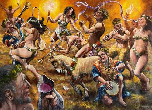 This beautiful rare and unusual painting is an illustration of the chaos of Bachus or Dionysus. Here Bachus the purple-stained wine god is accompanied by the Maenads, wild women flushed with wine and the Satyrs wild men with goat feet. The story of Bachus is a sad and tortured one. He was the son of Zeus but not of Zeus's wife Hera. Zeus had had a wild fling with a human girl Semele so Hera swore to kill Bachus.