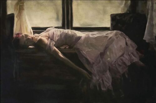 A figure suspended between reverie and exhaustion, resting in the fading light of evening. Chatterton’s Muse reflects the romantic tradition of poetic inspiration, where thought and feeling dissolve into silence and presence. The work speaks through atmosphere rather than narrative, capturing the quiet that follows intensity when only light and inward reflection remain.