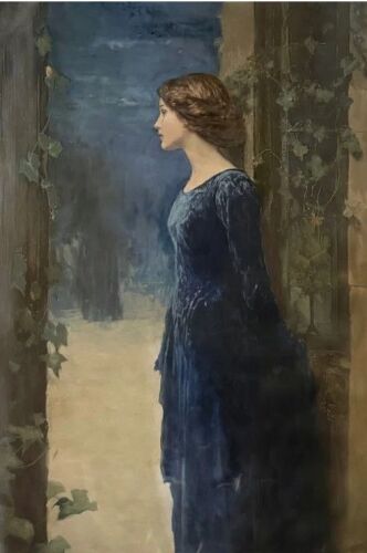 The composition invites the viewer into this suspended moment—intimate, contemplative, and charged with possibility. Rich, layered blues in the figure’s dress contrast with the softened stone and trailing ivy that frame her, creating a subtle interplay between structure and nature, presence and absence. Light is handled with restraint and sensitivity, guiding the eye while preserving the painting’s hushed atmosphere.